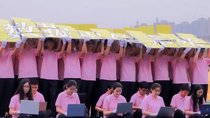 首先进行的项目是队列表演,为突出大数据与软件学院的团结精神和昂扬风貌,参与队列项目的同学们穿着整齐划一,带着事先精心准备的道具,踩着整齐的鼓点来到主席台前。他们高喊“软件编码世界,数据引领未来”的口号,朴素的衣装按奈不住一腔热血滚烫。一部分同学带着事先准备的展板,依靠自己手中的一小块纸板,翻转拼凑出所有的声音,向蓝天白云宣誓自己的信心。另一部分人拿出随声携带的电脑,盘膝而坐,以最朴实的姿态描绘另一个世界。