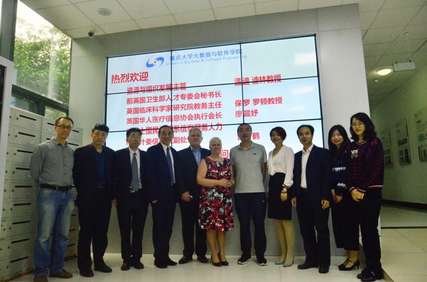 2018年4月26日上午,中英健康医疗大数据论坛的英方嘉宾受邀访问重庆大学大数据及软件学院。英方嘉宾有威尔士国民保健体系信息服务人力资源与组织发展主管温迪·迪林教授,中英医疗大健康合作董事、前英国卫生部人才专委会秘书长保罗·罗顿教授,英国华人医疗信息协会执行会长廖晨妤。重庆大学大数据与软件学院的熊庆宇院长、黄勇副院长、文俊浩副院长、陈蜀宇教授、张毅教授和学院相关研究基地的教师等出席研讨会。
