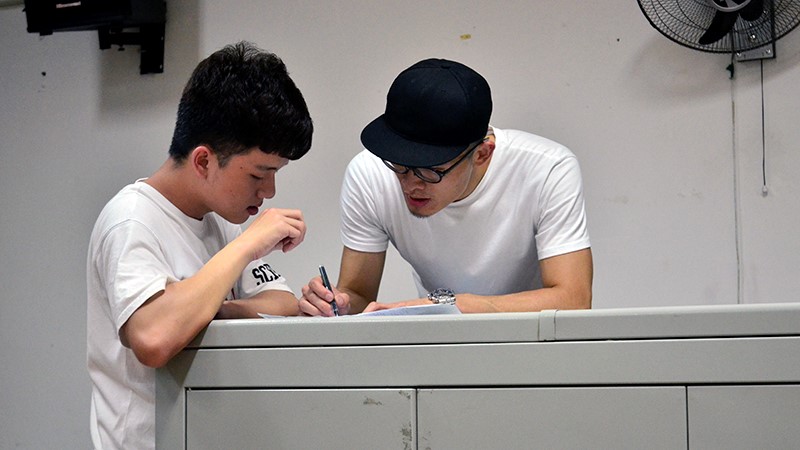 本次排练,负责指挥和朗诵部分的同学与合唱的同学一同到达了训练场地。除了在整体排练中把握指挥的动作和时机、帮助钢伴老师熟悉前奏部分外,晚上九点在演唱的同学解散后,他们留了下来接受老师的单独排练,认真负责地按照老师的建议对指挥动作、朗诵节奏进行修改。