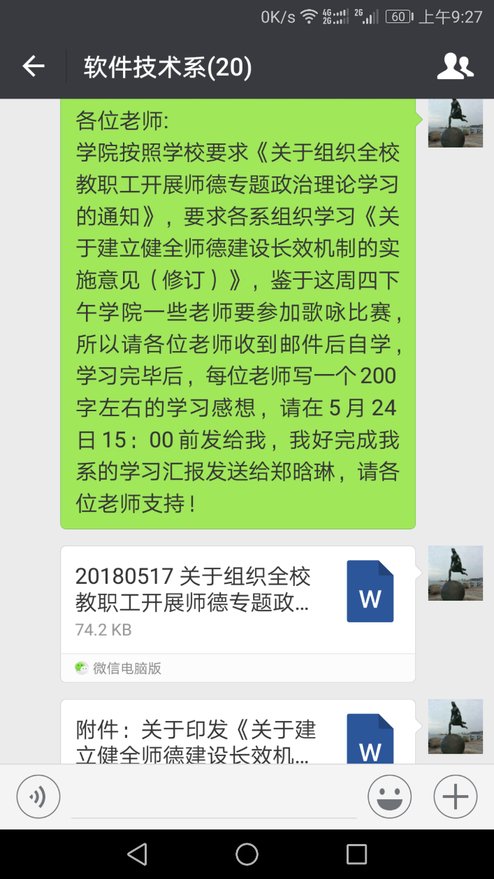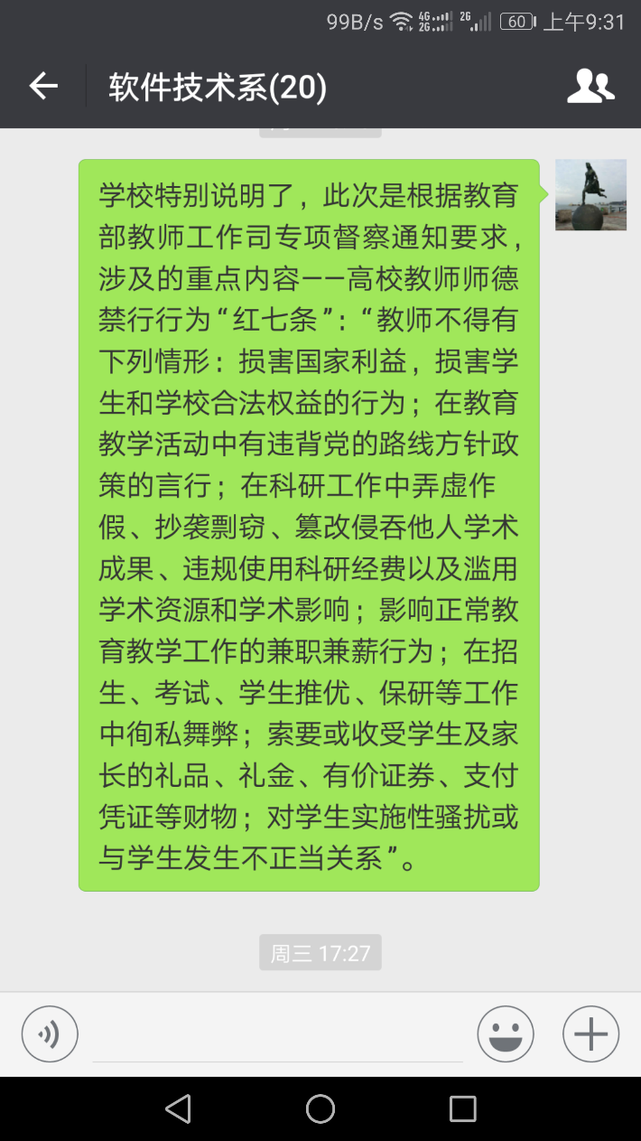 为认真学习贯彻党的十九大精神和习近平新时代中国特色社会主义思想,大力加强和改进师德建设,2018年5月17-25日,大数据与软件学院全院3个政治理论学习小组(软件技术系、应用软件系、院行政办公室)分别组织了关于师德专题政治理论学习,学习了《关于建立健全师德建设长效机制的实施意见(修订)》等内容,重点学习了高校教师师德禁行行为“红七条”,学习形式包括集中学习交流,线上学习讨论等。