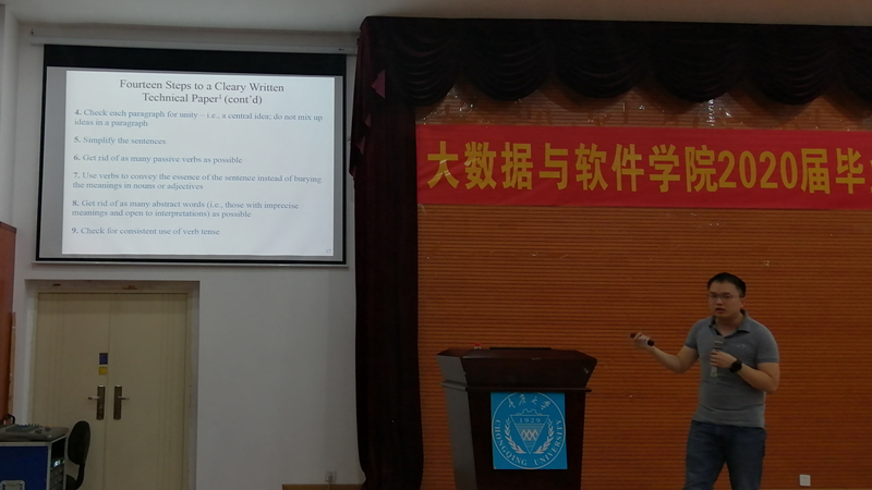 2019年5月27日,大数据与软件学院在学院楼报告厅举行了以出国留学指导与学术论文写作指导为主题的专题讲座《Publishing Your Research》。本次讲座邀请了重庆大学百人计划特聘研究员李秀华老师担任主讲人,来自学院各年级的同学参加了这次讲座。本次讲座由学院辅导员谭登梅主持。