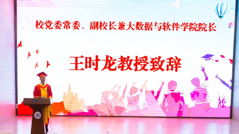 典礼第一个议程是全体起立,奏唱国歌。王时龙代表学校及学院全体师生员工向2021届全体毕业生及家人表示祝贺,向付出辛勤汗水的老师、家长们致以敬意和感谢。他表示,我们这几年一起见证了学院的发展和同学们的勤奋,一起迎来了党的十九大胜利召开、热烈庆祝了新中国成立70周年、改革开放40周年,纪念了五四运动100周年,举办了90周年校庆。回顾了2021届毕业生同学的硕果累累,王时龙勉励同学们要锤炼品德,肩负时代责任,做一个有家国情怀的人,在全面建设社会主义现代化国家的新征程途中,开拓个人高质量内涵式发展的新格局。